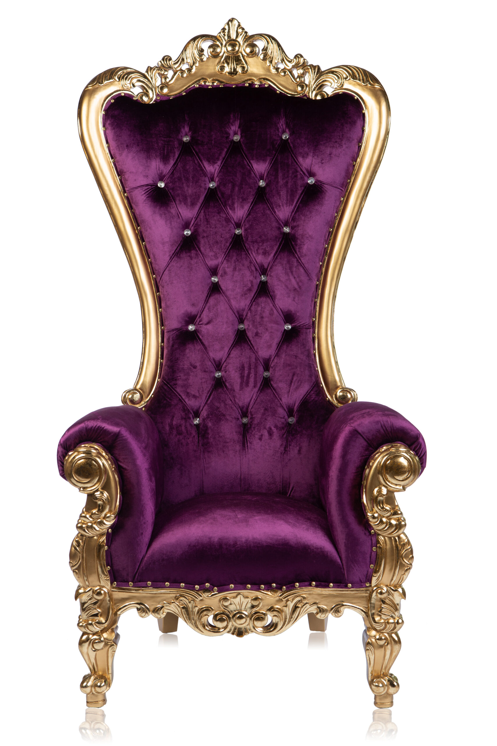 Elegantly decorated with Rococo-style motifs and finished with bright gold, glossy black or antique silver, this sumptuously padded throne is the perfect way to highlight the guest of honor. The shellback throne chair comes in a variety of color options including pink, red, blue, green, and purple velvet as well as black, gold and silver leather. With so many combinations, our throne chairs can fit any theme or color scheme you can dream of.